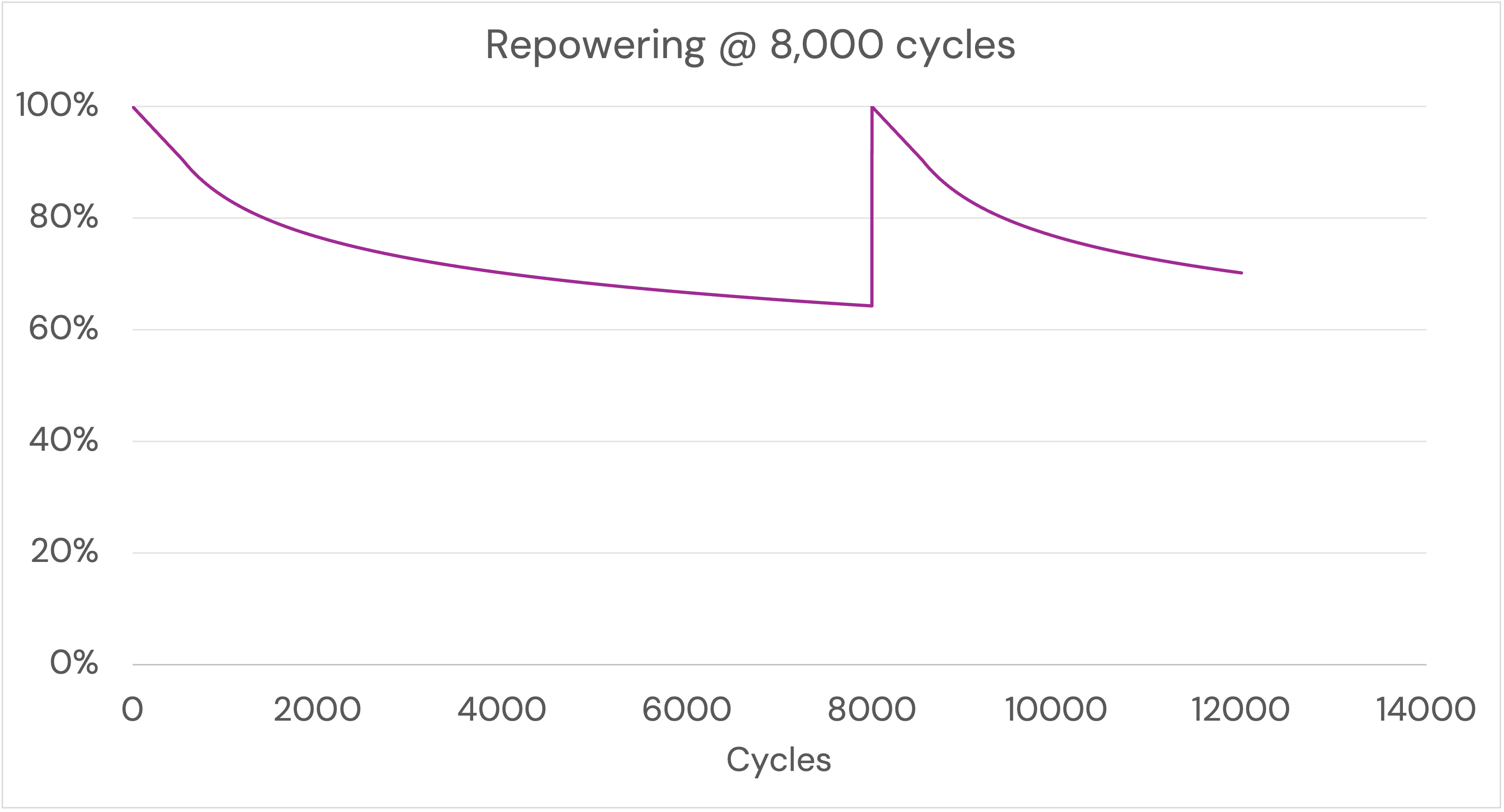 - Repowering - Determines when the site is repowered, that is, when the usable capacity returns to nameplate capacity. Repowering inputs are measured in terms of cycle count. See example below for repowering set to 8,000 cycles. This would be after 12 years if the battery was doing 2 cycles per day.