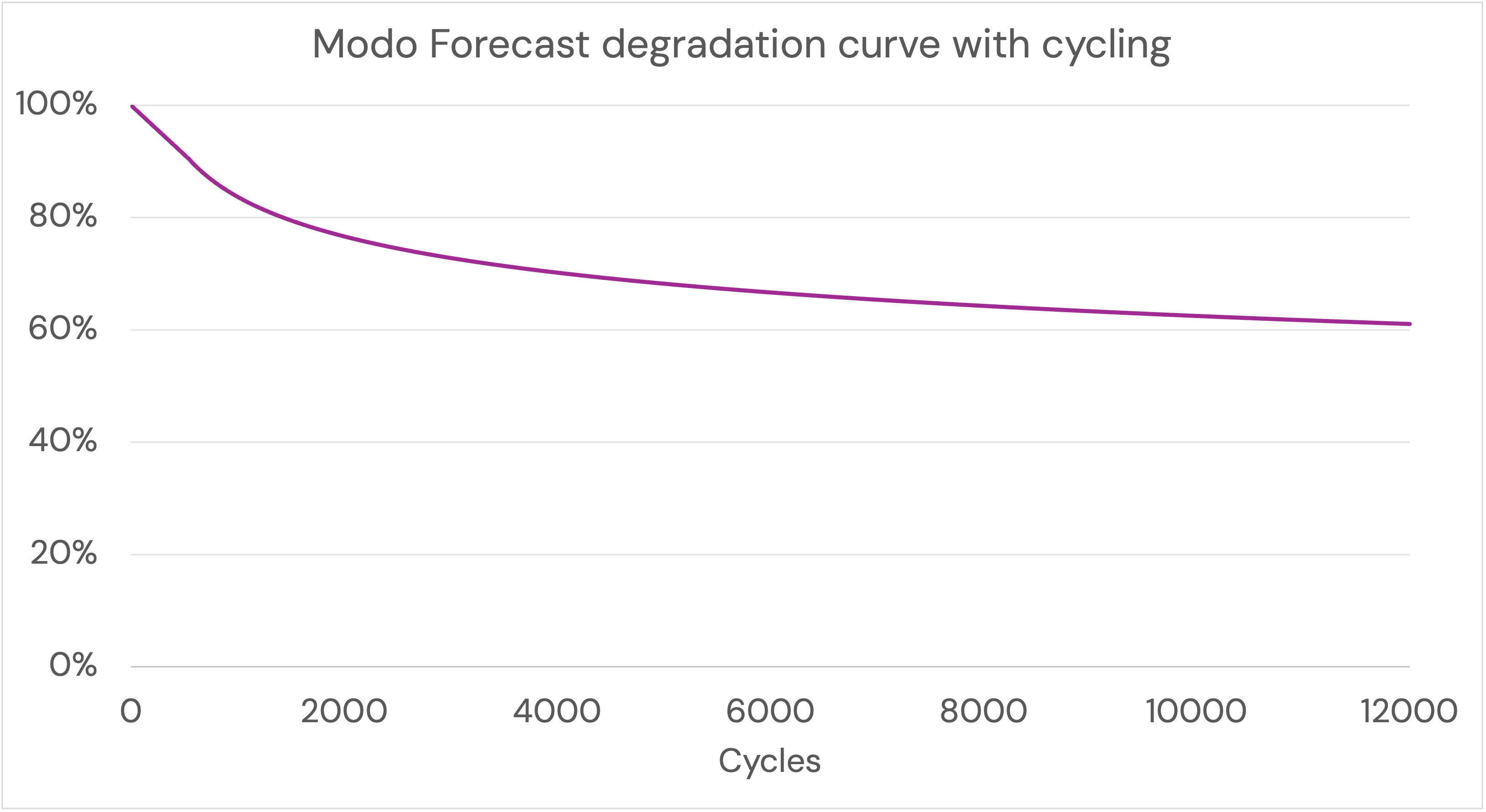 Here, if a system has a nameplate capacity of 100MWh on commissioning, we expect the site to have only ~60% (or 60MWh) of usable capacity after 12,000 cycles.