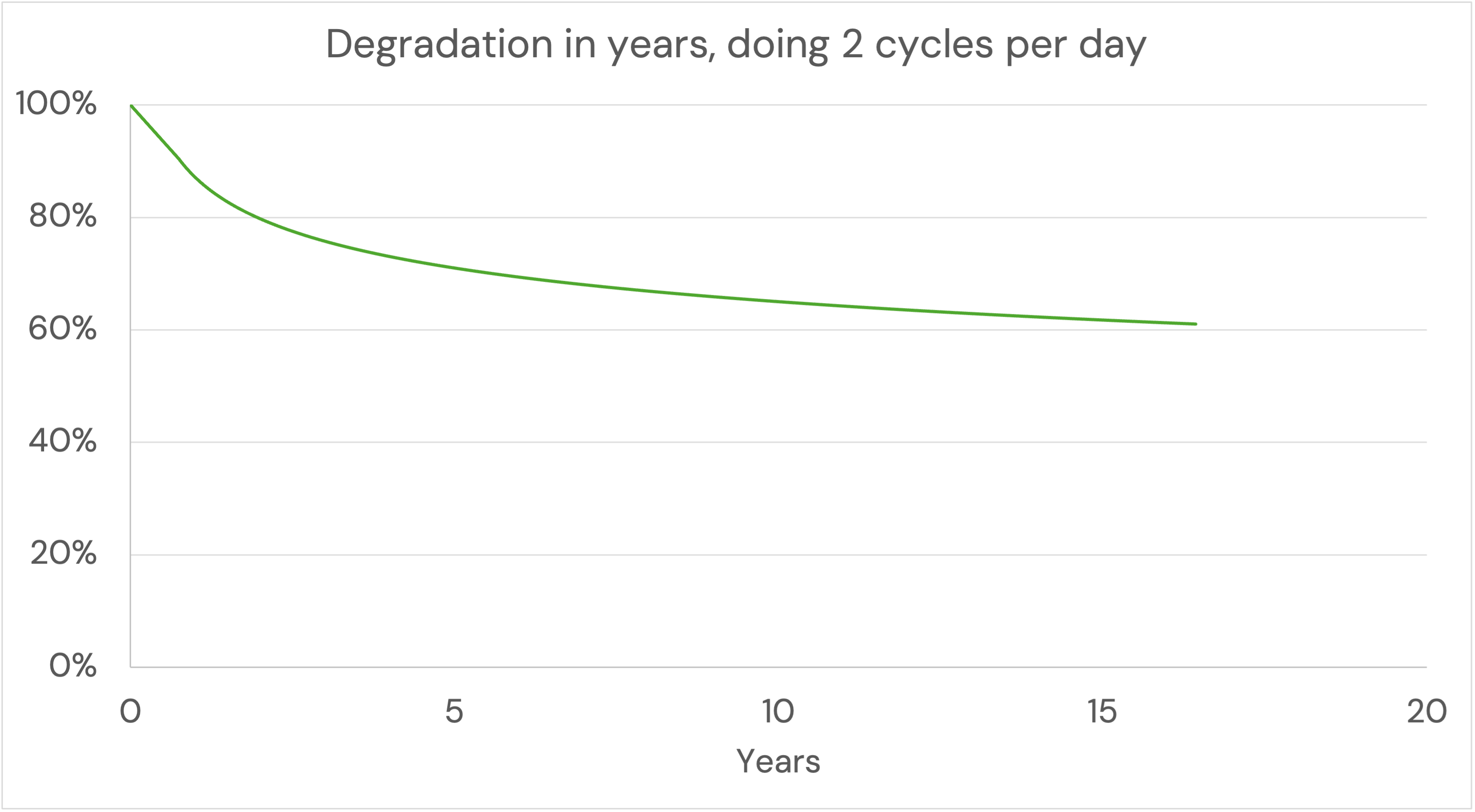 Degradation is modeled in terms of cycles - ie how much capacity will remain after 10,000 cycles, for example. For a 100MWh nameplate-capacity site, this would be equivalent to the battery having discharged 10,000 * 100 MWh = 1 million MWh or 1TWh during its lifetime.