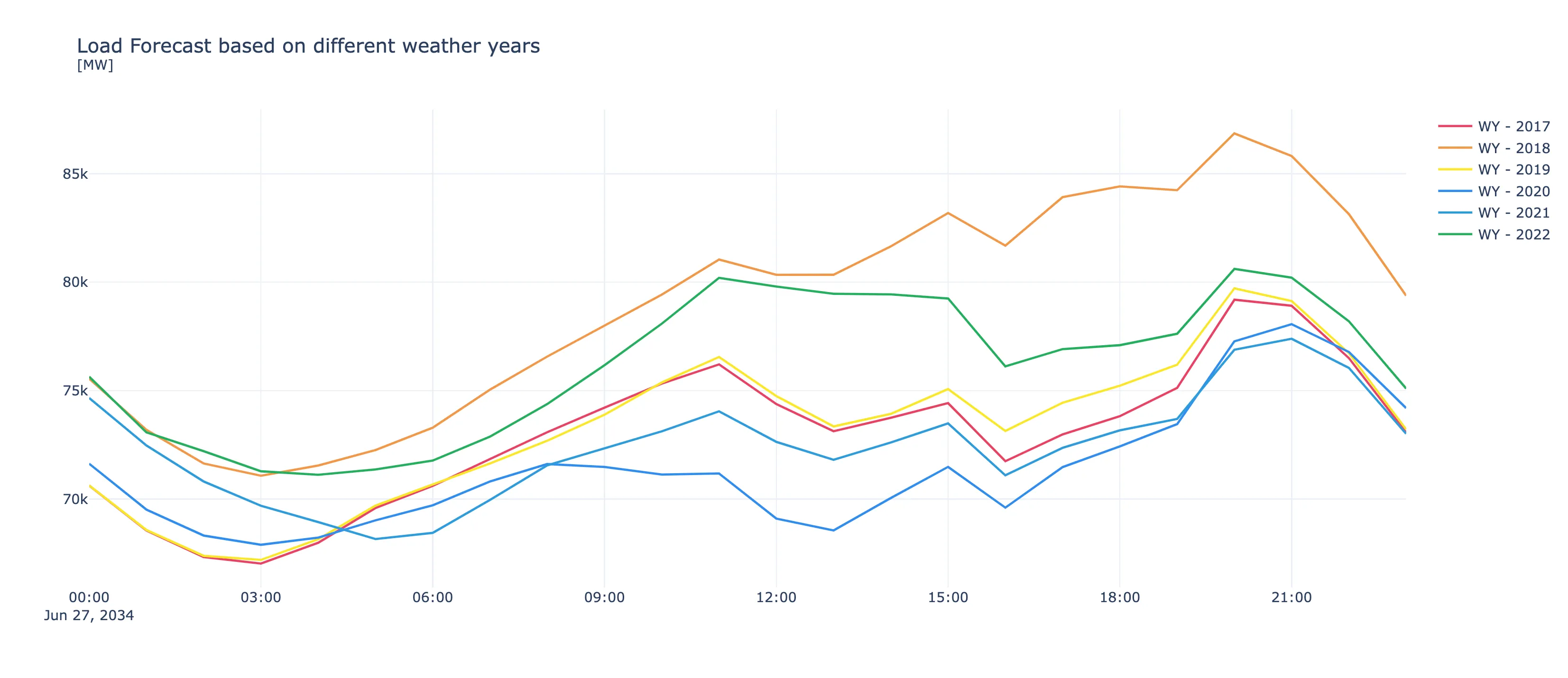 ERCOT’s LTLF timeseries data represents a “median” (p50) weather year using 2008 data. We extend this by enabling alternative weather-year load shapes to be layered on top of ERCOT’s values—supporting higher/lower demand cases and aligning the demand shapes with our renewable load-factor weather years for consistent scenario analysis.