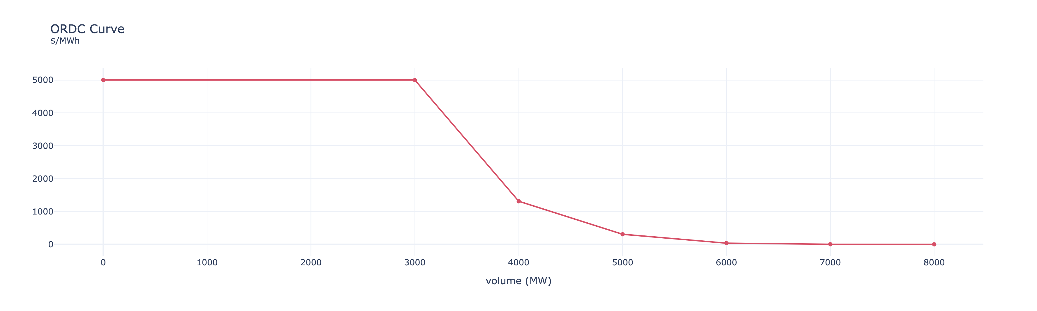 In the model, reserve margin is proxied by measuring available headroom across dispatchable thermal generation and energy storage assets across the whole system. Specifically, it is calculated as the sum of thermal generator headroom (High Sustained Limit minus Base Point) and available storage capacity (accounting for state of charge constraints). A fixed system-wide operating margin of 8 GW is enforced, reflecting the width of the ORDC curve and inspired by ERCOT’s Real-Time Operating Capacity (RTOLCAP) concept.