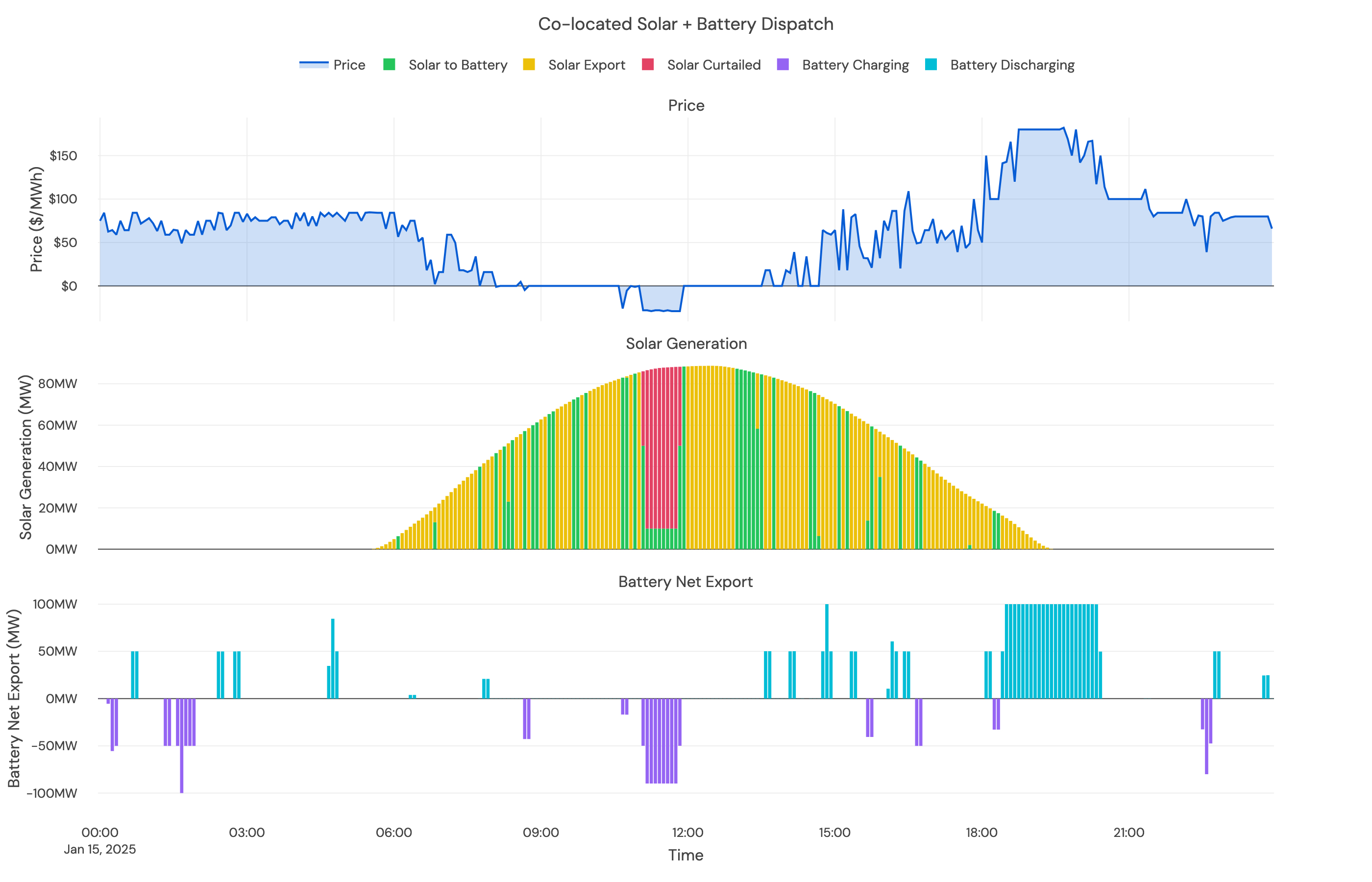 The co-location feature models battery and solar assets operating at the same site. The dispatch model optimises whether solar generation should export directly to the grid or charge the battery, maximising total site revenue.